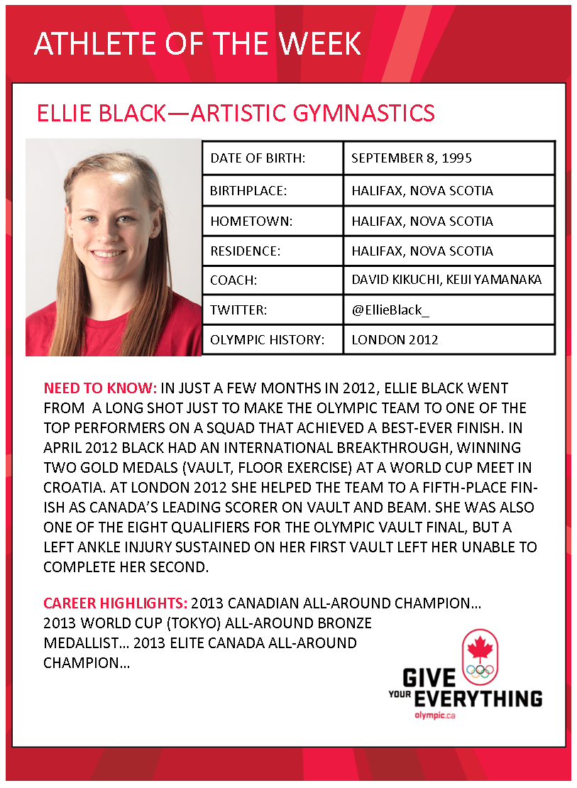 She is the 2014 commonwealth games beam champion and the 2015 pan american games all around, beam and floor champion. When and where ellie black was born? Black was selected for the 2016 olympic team. No canadian woman has ever won an olympic medal in traditional gymnastics, but black might do it in tokyo.
